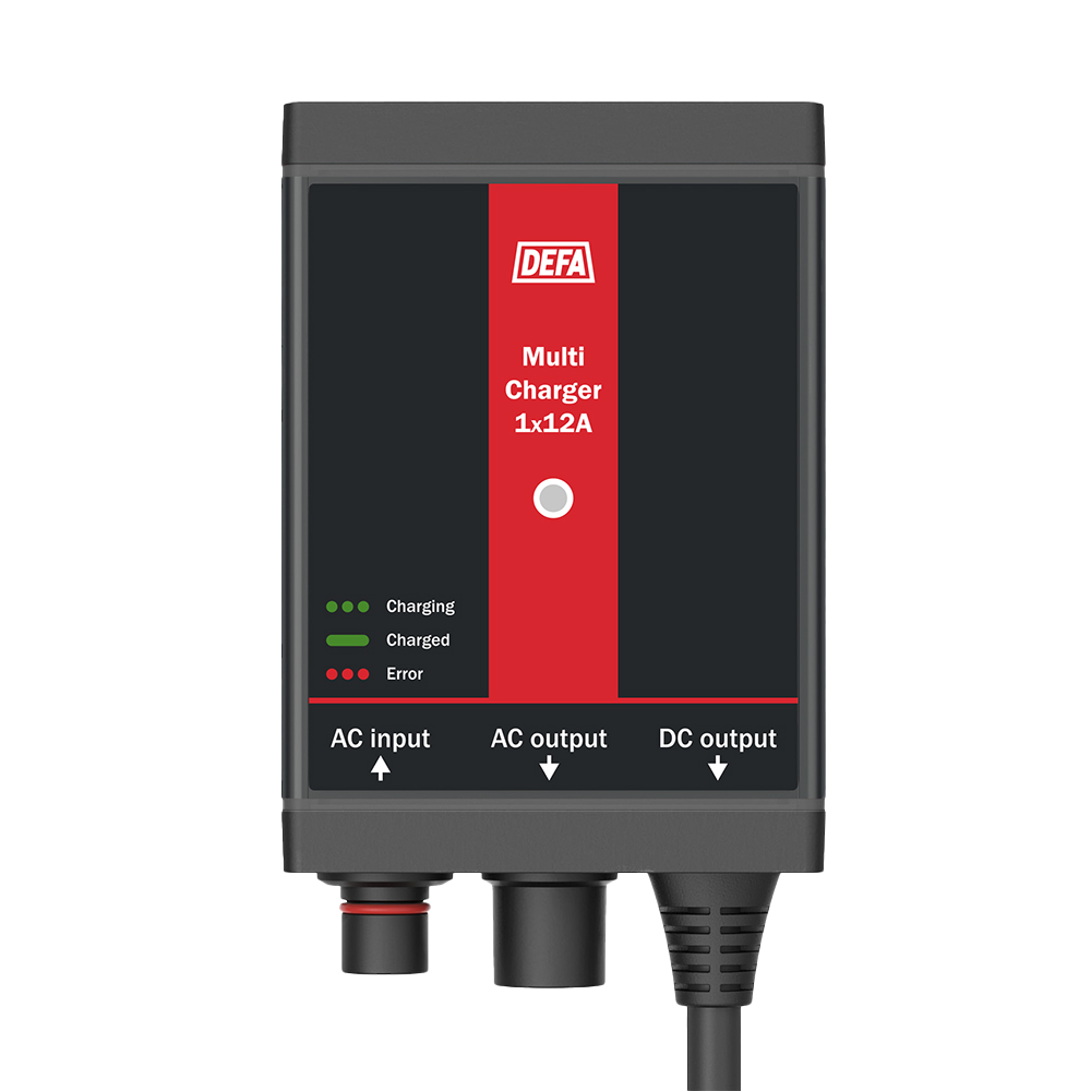 DEFA MultiCharger 1x12A är en 12V, 12A batteriladdare för fast installation och är lämplig för batteristorlekar upp till 150Ah.